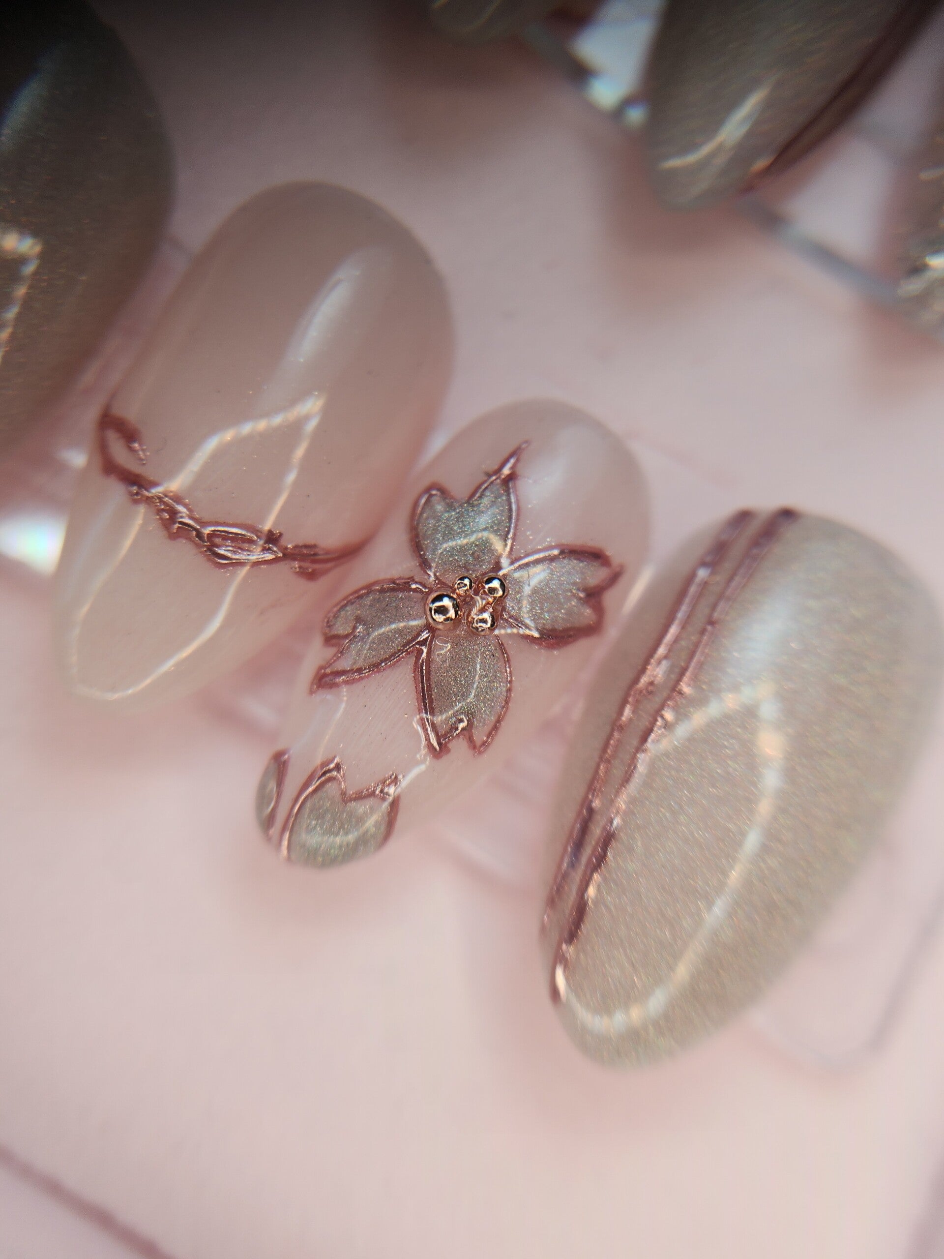 Rose Blossom is een elegante press-on set waarin zachte nude tinten samenkomen met subtiele shimmer en verfijnde accenten.